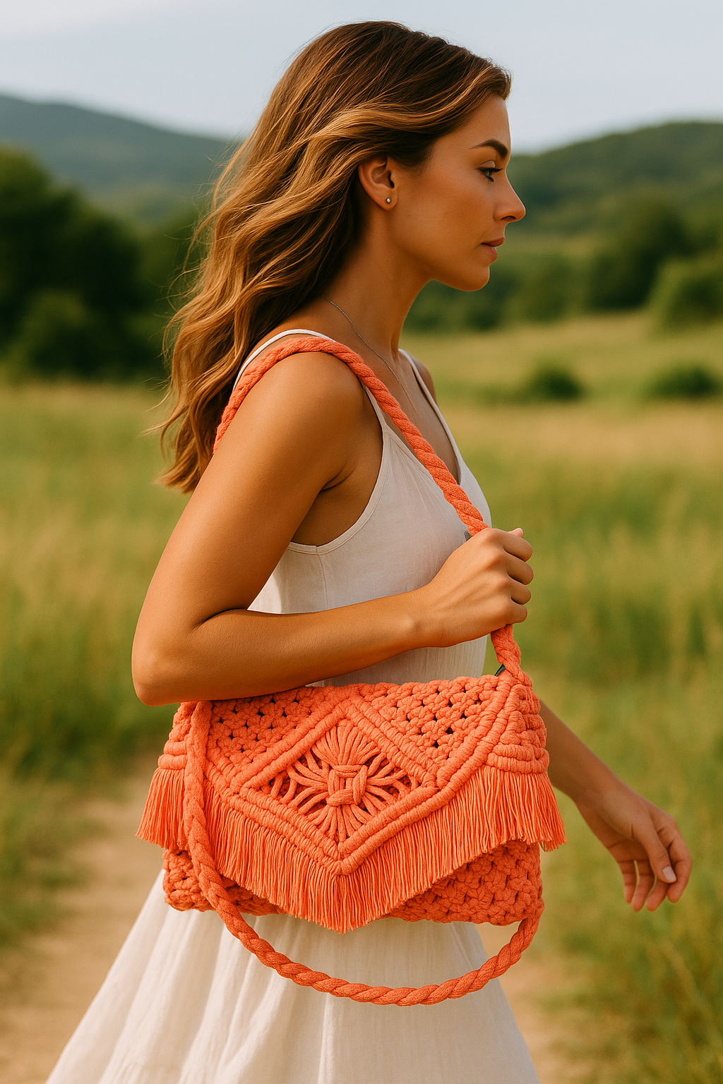 Bolso artesanal de macramé coral – Una pieza única que ilumina tu estilo
