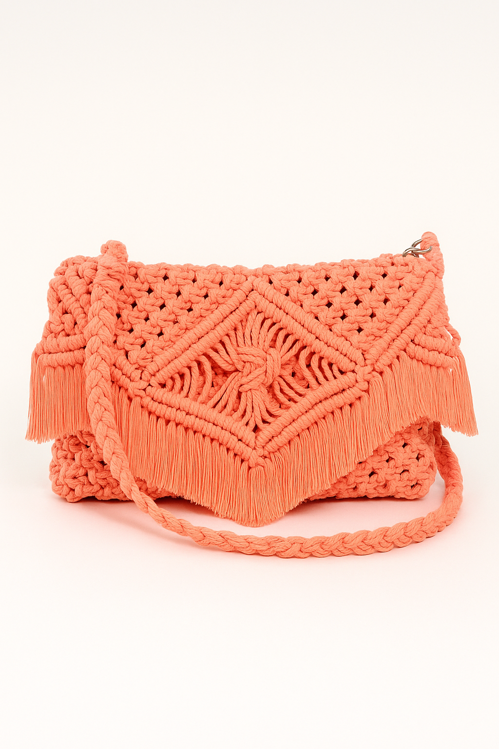 Haz tuyo este bolso de macramé coral y lleva contigo la energía del verano en cada paso.
